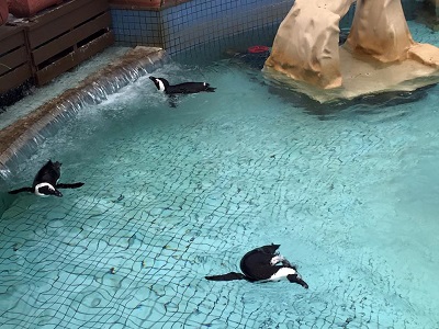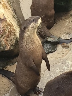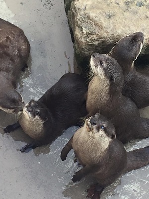 キーパーさんを待つカワウソ。13時45分からの食事タイムは見れた。今いる5頭はアンギラスとピグモン、子供が3頭だそうだ。オスの1頭が再三脱走を図ったためバックヤードにいるとか。