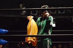 学業優先のため、しばらくの間プロレスを休業することを発表した木場千景が挨拶(右写真)。「突然のことになってしまいまして申し訳ございません。公式にも出た通り、学業との両立が難しくなってしまって、当分休業させていただくことになりました。正直、どうしたらいいんだろうってメチャクチャ悩んで、甲田代表とか高木大社長とかコーチとか両親に相談して、休業を決めました。でも東京女子を辞めるわけではないので、絶対にここに戻ってきます。リング上に戻ってくるので、その時まで待っていてください。よろしくお願いします。」