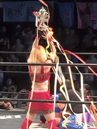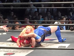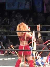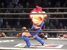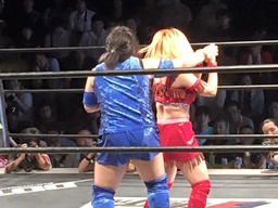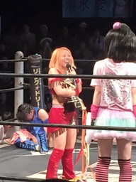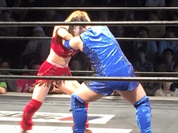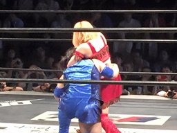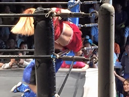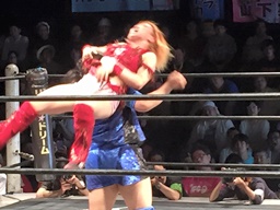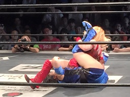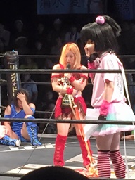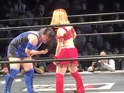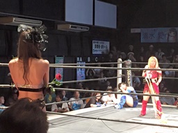 美威獅鬼軍が姿を現す(左写真)。赤井「あなたがプリンセスですって?ずいぶんと薄汚れたシンデレラだこと。あなた1日に2試合もされて頭がおかしくなったんじゃなくて?いいわ、9月新宿FACE、私がお試愛してさしあげてもよくってよ。」