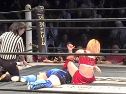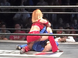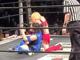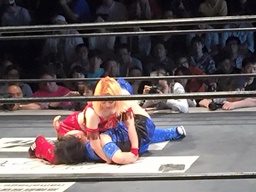 ミウラブレーンバスター狙う、中島はワキ固めに切り返す(右写真)。