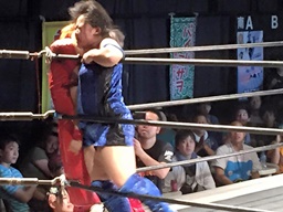 ミウラエルボー、ボディスラム3連発、カウント2。コーナーに振って串刺しエルボー、中島はエプロンに出てロープの間からヘッドバット(左写真)、