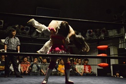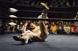 ロープワーク、辰巳ドロップダウン、リープフロッグからジャンピングヒップアタックで倒しエルボードロップ(右写真)、カウント2。2発目かわして山下もエルボードロップ、辰巳かわす。