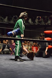 そのまま胸で圧迫(左写真)、ハイパミロープ。そのまま場外に逃げる、のの子追う。