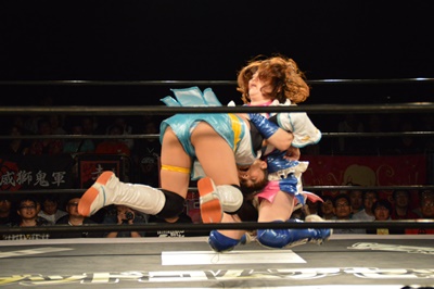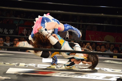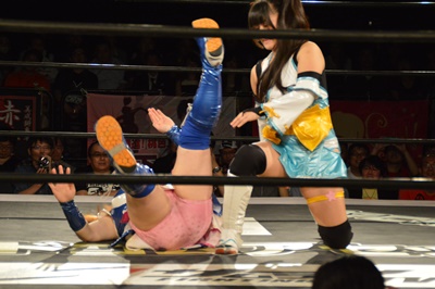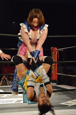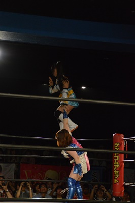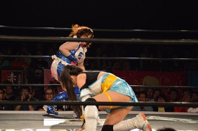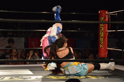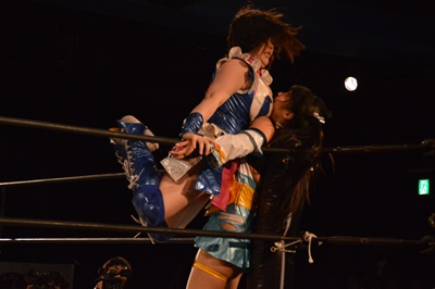 のの子ストンピング、首投げからボディプレス、カウント2。のの子ガットショット、ロープに飛ぶ、清水はウラカンホイップ(右写真)、エルボードロップ、カウント2。