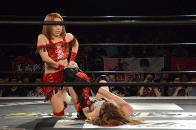 赤井エルボーかわしスリーパーに(右写真)。愛さん「しぼってくださいまし!」