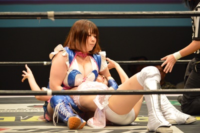 あずさエルボー(左写真)、キック、首投げからカバー、カウント2。