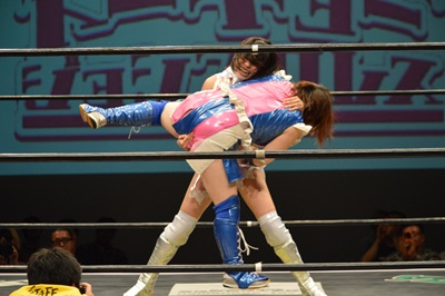 あずさボディスラム狙うがのの子ブロック、ボディアタック(右写真)。