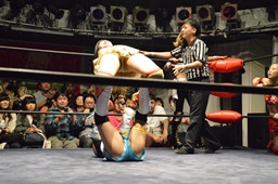 辰巳串刺しエルボー、えーりんかわしスクールボーイ(右写真)、カウント2。5分経過。
