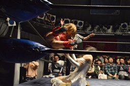 ボディプレス(右写真)、カウント2。清水にタッチ。
