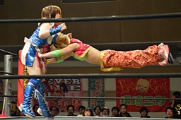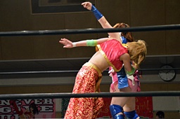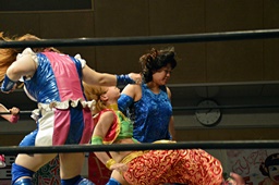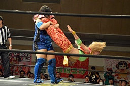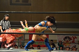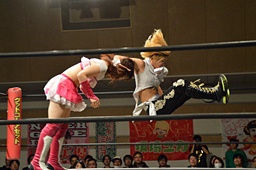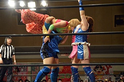 KANNAエルボー、首投げからチンロック(右写真)、あずさロープ。KANNAはのの子にタッチ。