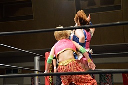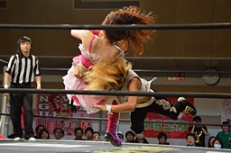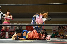 KANNAバックドロップ狙う、山下ブロックしてエルボースタッブ、KANNA強引にバックドロップ(左写真)。坂崎がカット。