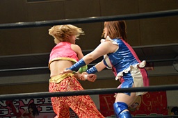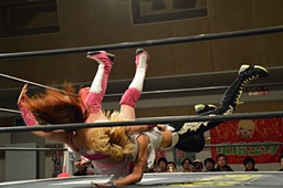 ロープに飛ぶ、KANNAカウンターのキチンシンク(左写真)。KANNAネックロックに捕らえて自軍コーナーに戻りのの子にタッチ。山下脱出、坂崎にタッチ。