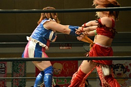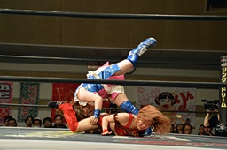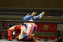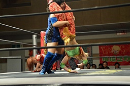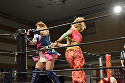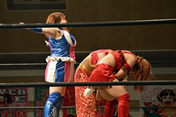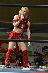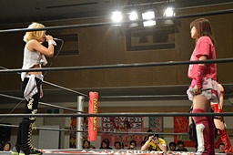 山下は今日3カウント取られたKANNAを呼び込み、12月春日部で行われる権利証の最後の防衛戦の相手に指名。KANNA「望むところだよ。私はお前を倒すために美威獅鬼軍に入っていろいろ学んできた。その成果を見せるために春日部、シングルでやりましょう。勝つのは私です。」(左写真)