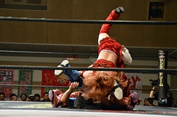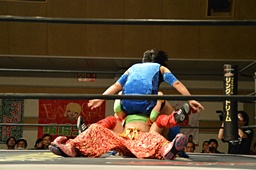 中島がジャックナイフ(左写真)、カウント3。ミウラ失格。