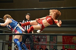 坂崎ロープに飛ぶ、のの子K'sプレス(左写真)、カウント2。
