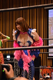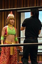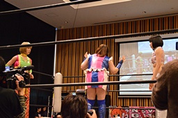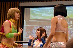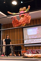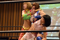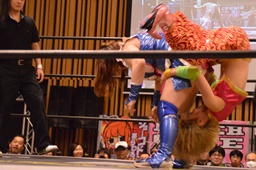 ロープに振ってダブルのバックエルボー(右写真)からハイファイヴエルボードロップ、あずさがカバー、坂崎カット。坂崎カバー、あずさカット。