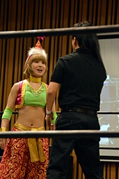 木曽レフェリーが帽子をスルーするのでユカッチアピール(左写真)、