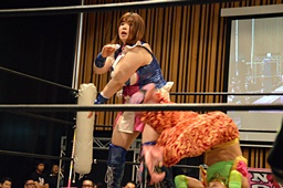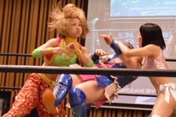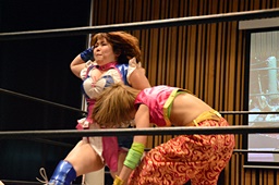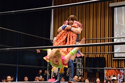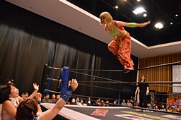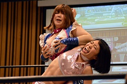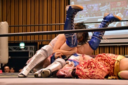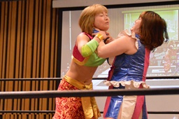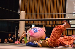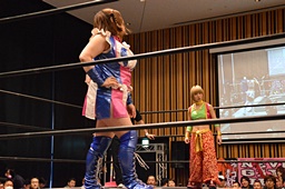 坂崎がのの子にヘッドロック(右写真)、背後に回ってスクールボーイ、カウント2。