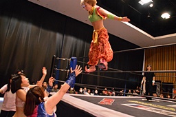坂崎がエプロンにいたあずさに激突(左写真)、あずさ場外転落。