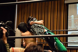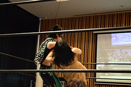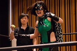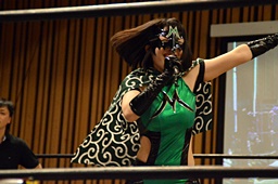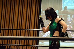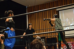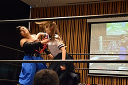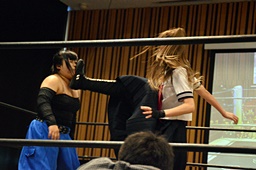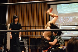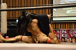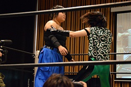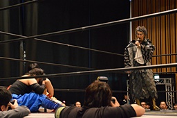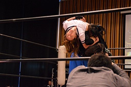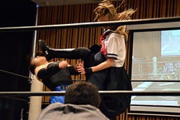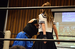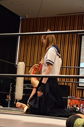 やけになって大振りのパンチを繰り出すがえーりんかわしてネックブリーカードロップ(右写真)、ミウラにタッチ。ハイパミも赤宮にタッチ。