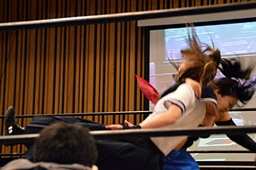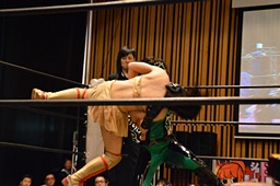えーりんエルボー、赤宮キャッチして大外刈り(右写真)、カウント2。
