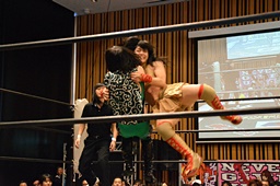 ミウラ赤宮をコーナーに振って突っ込む、赤宮かわす、そこにハイパミがカウンターのダイビングクロスボディ(左写真)。