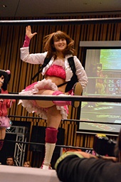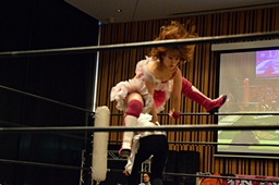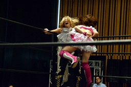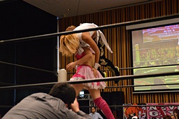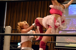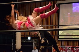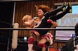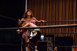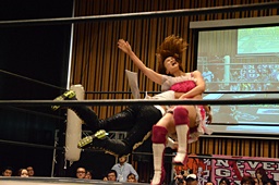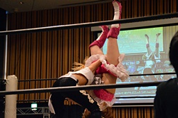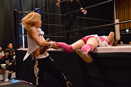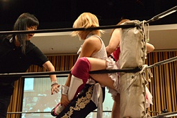 山下クラッシュラビットヒート狙う、KANNAかわしてバックドロップ(左写真)、カウント2。