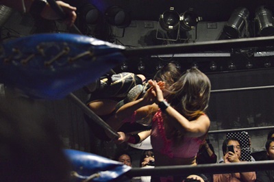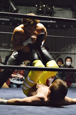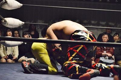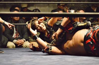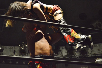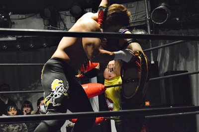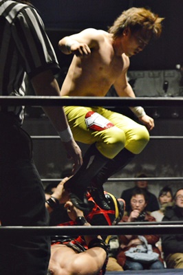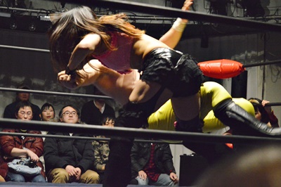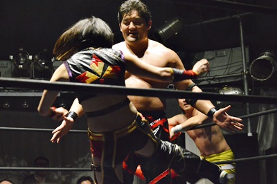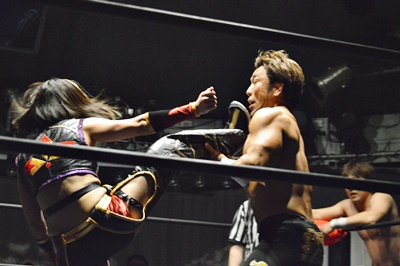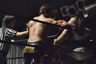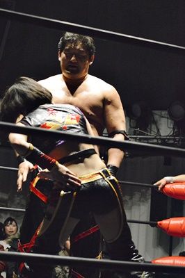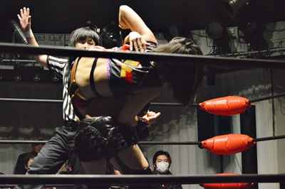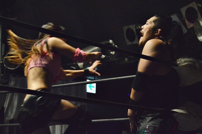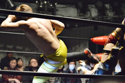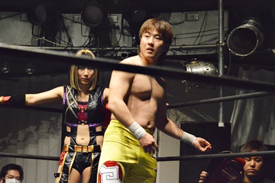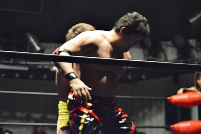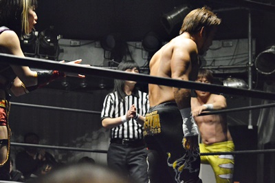 フライングメイヤーとヘッドシザーズの応酬、石川に向かって行くFUMA(右写真)。石川ロープに飛ぶ、FUMAジャンピングハイキック、美央にタッチ。
