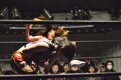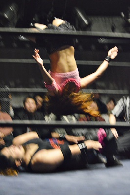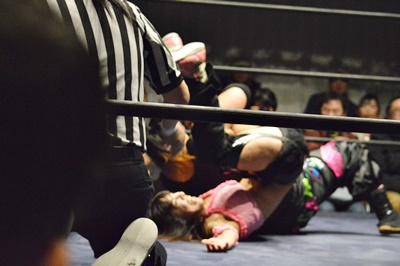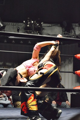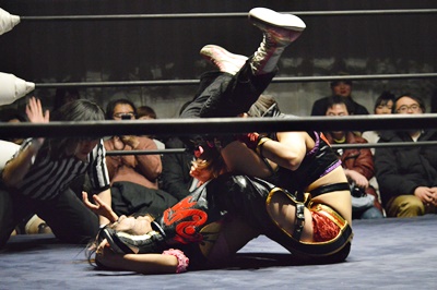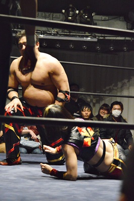 チェリーがFUMAにどっこいしょ!(右写真)、カウント2。ダブりリストアームサルト狙う、FUMAブロック。FUMAハーフハッチ、美央にタッチ。