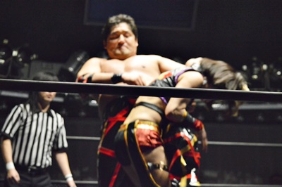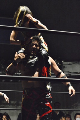 FUMAがバックドロップ狙うが石川はブロック(右写真)。諸橋にタッチ。