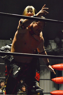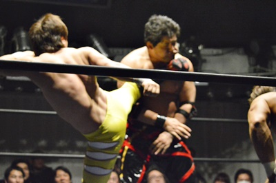 諸橋にキック(右写真)。諸橋ターンバックルにぶつけ石川にタッチ。