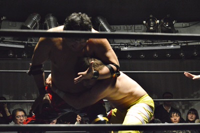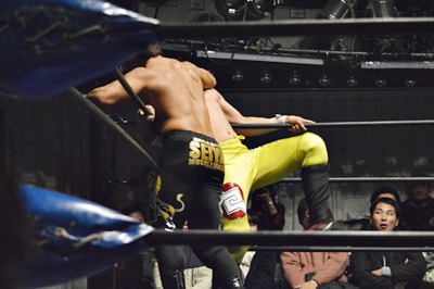先発は石川とFUMA。FUMAローキックからタックル、石川がぶる(左写真)。