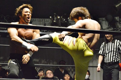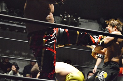 諸橋ダイビングヘッドバット、FUMA足を立てて迎撃(左写真)。