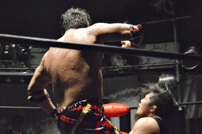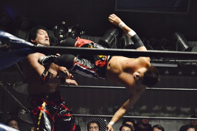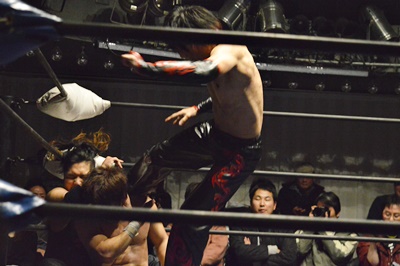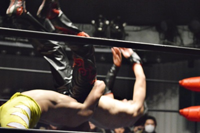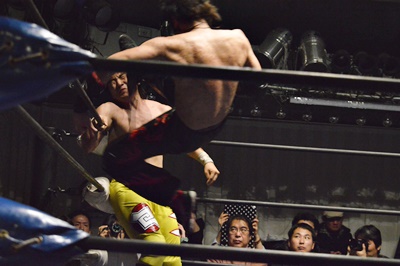 石川ニーリフト、バックドロップ(右写真)、FUMAがカット。イサミがFUMAを場外に落としトペ・スイシーダ。