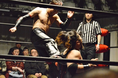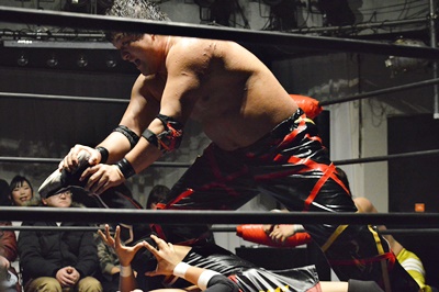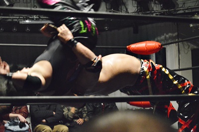 石川FUMAにダブルフットスタンプ(右写真)、カウント2。スプラッシュマウンテン狙うがFUMAブロック。