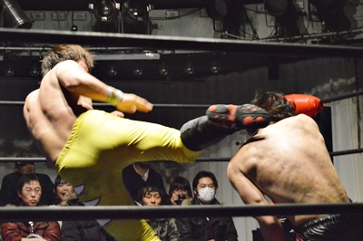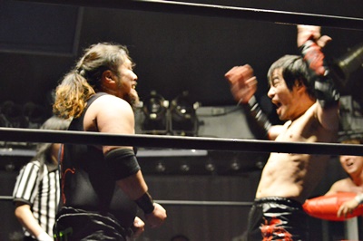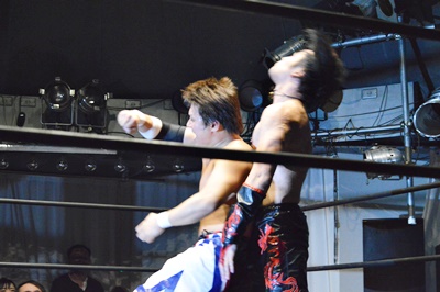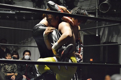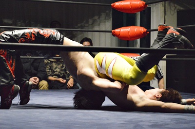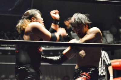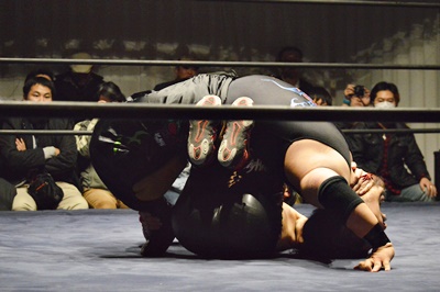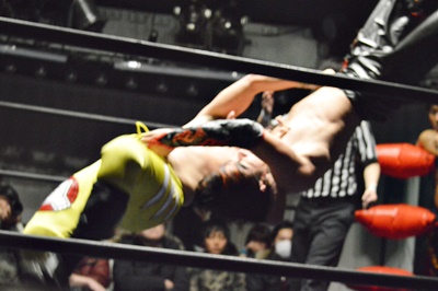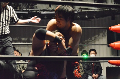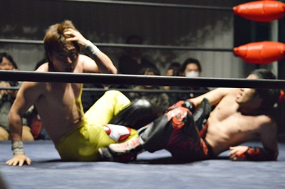 FUMA顔面ソバット、イサミかわすとジャーマン(右写真)、カウント2。
