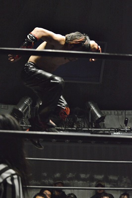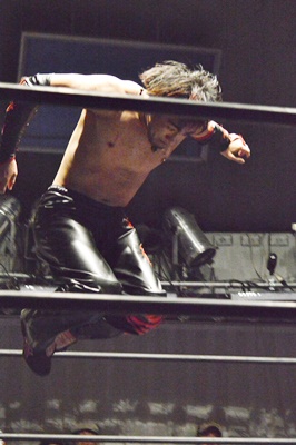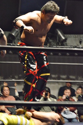 イサミボディスラム、コーナーに上ってダイビングニードロップ(左写真)。