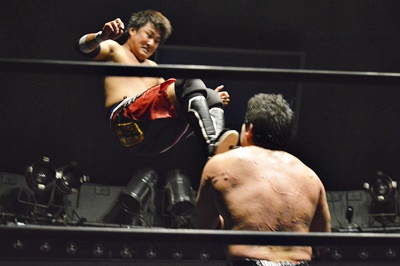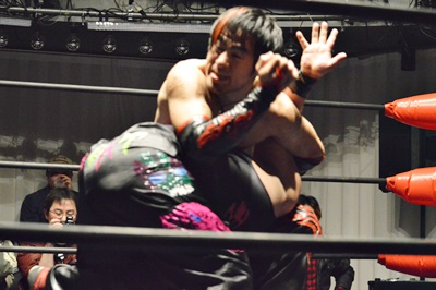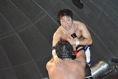 首投げから弓矢固め(右写真)、SAGATロープ。石川入ってボディスラムからフットスタンプ、カウント2。石川ボディスラム、イサミがトペ・アトミコ、カウント2。