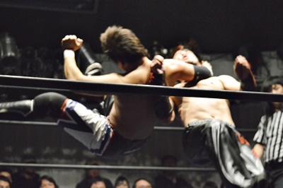 風戸コーナーに上る、石川エプロンからノドをつかむ(左写真)、風戸もノドをつかみ返し、スイングDDTの要領で石川ごと場外に。