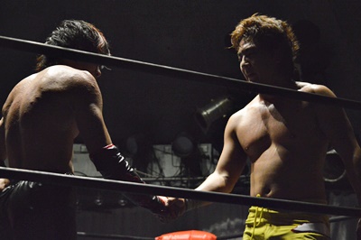 イサミ「ボディがお留守だぜ!」(左写真)。ロープワーク、SAGATゴアグラインド、FUMAにタッチ。イサミも石川にタッチ。