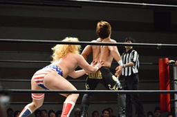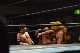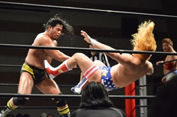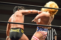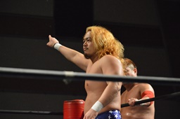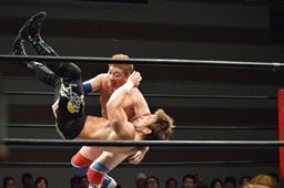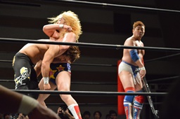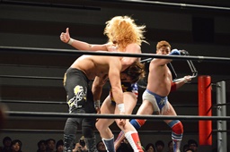 諸橋ジャーマン狙う、福田ブロック。宮本が入ってラリアット、福田かわして諸橋に誤爆(右写真)。誤爆?