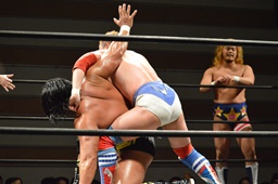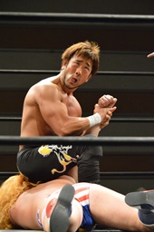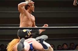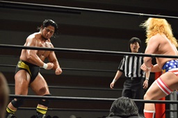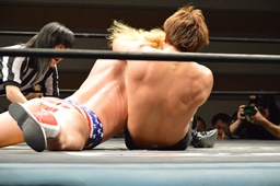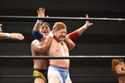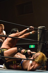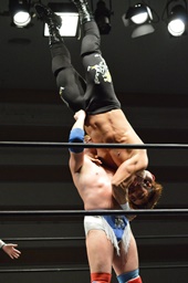 テイオー切り返してフルネルソンからコブラツイスト(右写真)。福田にタッチ。