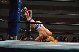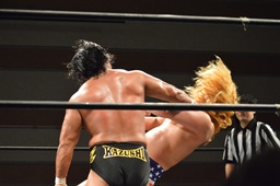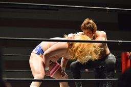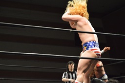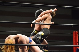 福田は諸橋を2度ターンバックルにぶつけ、コーナーに上ってファイヴスターダブルアックスハンドル、諸橋パンチで迎撃(右写真)。10分経過。