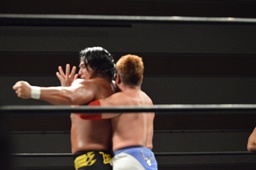諸橋ストンピング、パンチ。福田ロープにすがる。諸橋突っ込む、福田ロープを引き下げて諸橋を場外に落とす。テイオーと2人で交互にチョップ(右写真)。しかし福田の鉄柱攻撃はかわされる。諸橋リングに戻してストンピング、宮本にタッチ。5分経過。