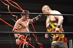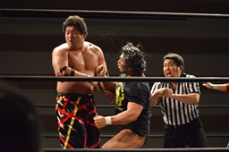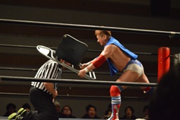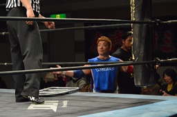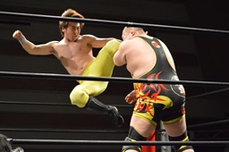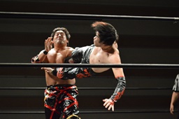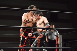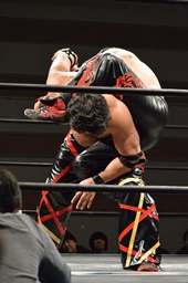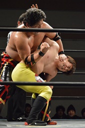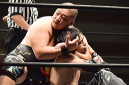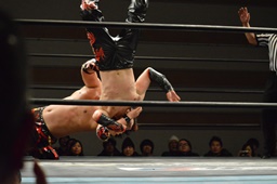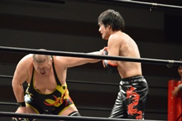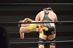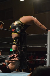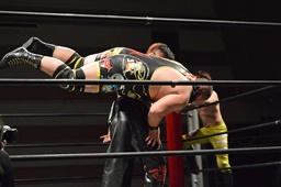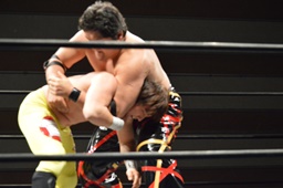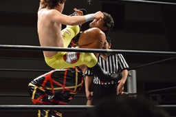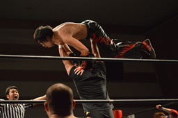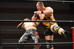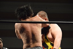 イサミタックル、柴田切る、イサミが柴田の腕をひねる(左写真)、柴田切り返す、イサミ切り返す。柴田ボディスラム。イサミ場外エスケープ。5分経過。