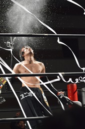 エルボーの打ち合いからイサミは「ボディがお留守だぜ!」(左写真)