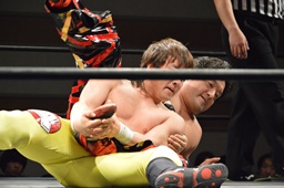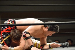 FUMA足をすくってレッグロック(右写真)、石川キーロックに切り返す。FUMA立ち上がってケサ固めに、石川エビ固め、カウント1。石川上になって肩固め、両者立ち上がる。
