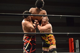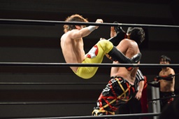 コーナーに振って串刺しエルボー、FUMAジャーマン狙う、柴田ブロック。FUMAロープに飛ぶ、柴田フライングボディシザーズドロップ(左写真)、石川にタッチ。