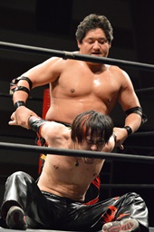 宮本がイサミをリフトアップアンドスラム(右写真)。