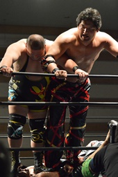 柴田コーナーに振って突進、イサミかわしてボディスラム(左写真)、FUMAにタッチ。